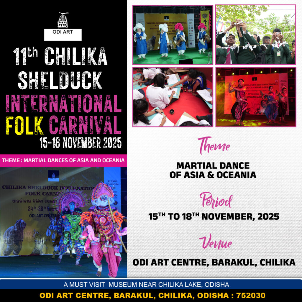 The five-day-long CHILIKA SHELDUCK INTERNATIONAL FOLK ART CARNIVAL commemorating the cultural diversity of the people through MYTH, MIGRATION & MODERNITY. This experiential festival at ODI ART Centre involves traditional artists from India and other countries to interact with the audience and establish a network of their market connections. The visitors have an opportunity to learn more about the diverse cultures and arts through the various workshops during the carnival, including museum visit, heritage education, storytelling session and local culinary culture.