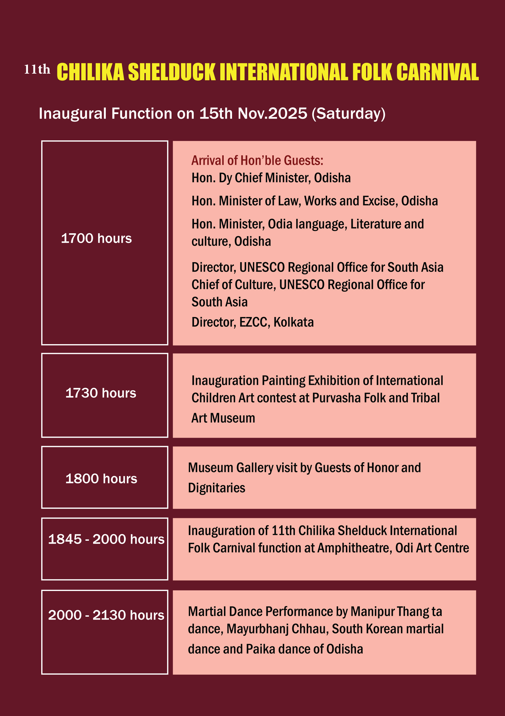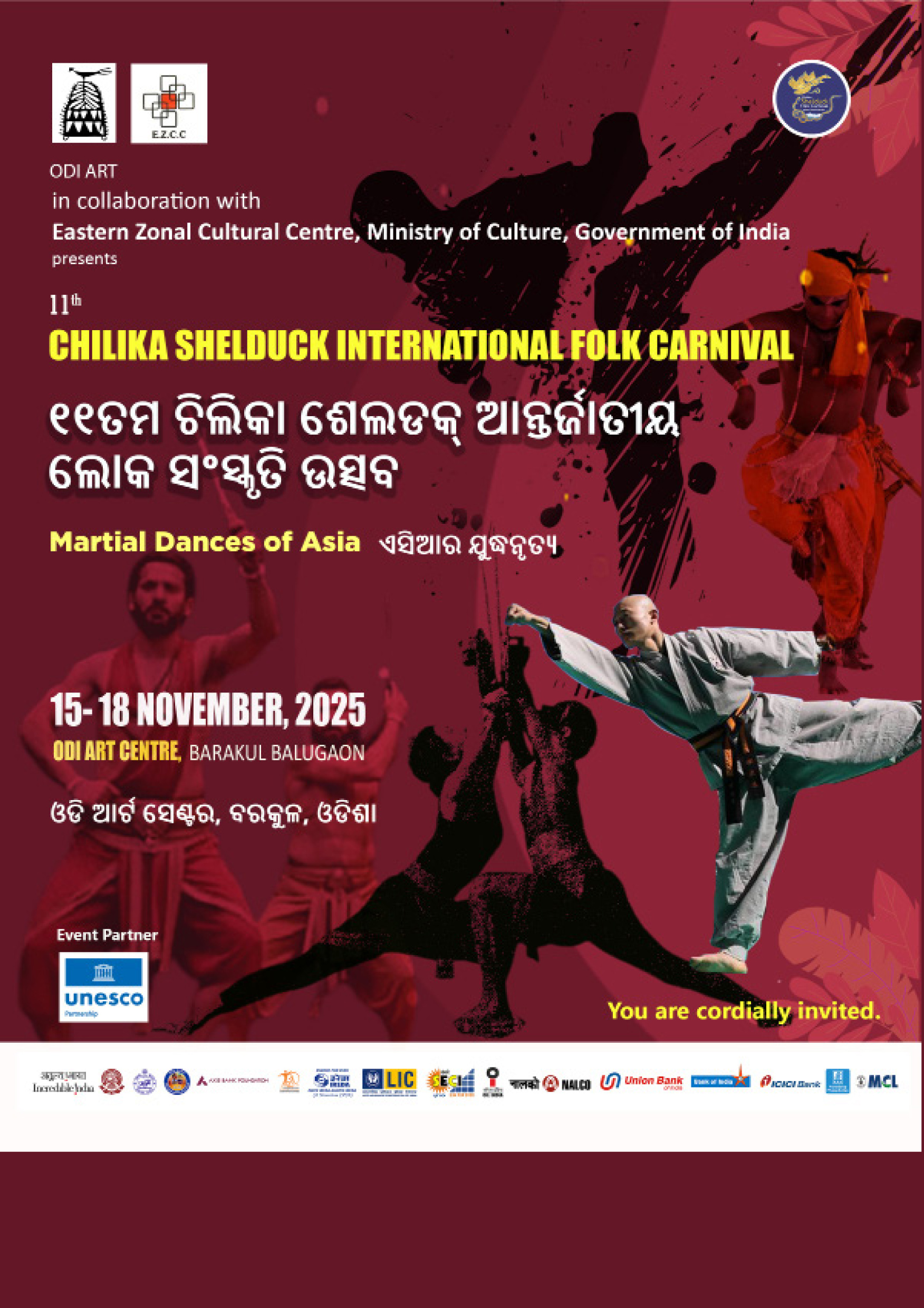 The five-day-long CHILIKA SHELDUCK INTERNATIONAL FOLK ART CARNIVAL  commemorating the cultural diversity of the people through MYTH, MIGRATION & MODERNITY. This experiential festival at ODI ART Centre involves traditional artists from India and other countries to interact with the audience and establish a network of their market connections. The visitors have an opportunity to learn more about the diverse cultures and arts through the various workshops during the carnival, including museum visit, heritage education, storytelling session and local culinary culture.
